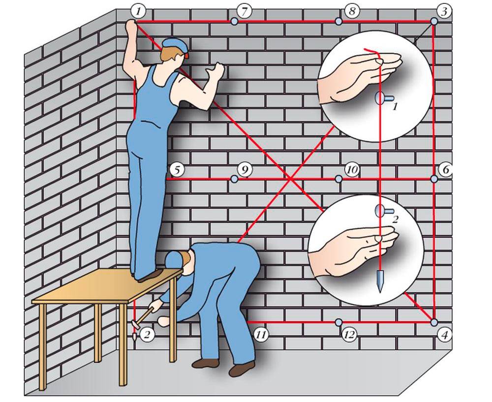 Метод строится на пересечении отвесов — две вертикальные нити. К ним крепится одна горизонтальная. Там, где она касается стены, ставят маяк.
