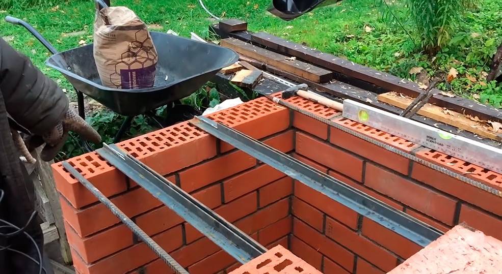 Что у нас получилось в финале с нашим мангалом: выложили мы из дешевого пустого кирпича восемь рядов и девятый ряд положили на металлические уголки. Внутри также лежит арматура для лучшей крепости.