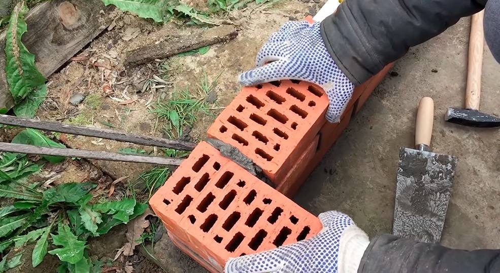 Основанием служит железобетонный фундамент. Кирпичи укладывают в длину. Каждый последующий ряд смещают так, чтобы шов приходился на центр изделия, расположенного снизу. Разбить керамику на две равные части сложно. Лучше сделать срез болгаркой с диском по бетону. Раствор укладывают одинаковым слоем в 1 см. Для проверки применяют арматурный прут сечением 1 см либо порядовку — рейку с нанесенными на нее размерами. Каждые три яруса проверяют рулеткой и строительным уровнем. Чтобы правильно выставить сборный элемент, по его сторонам и сверху постукивают резиновой киянкой.