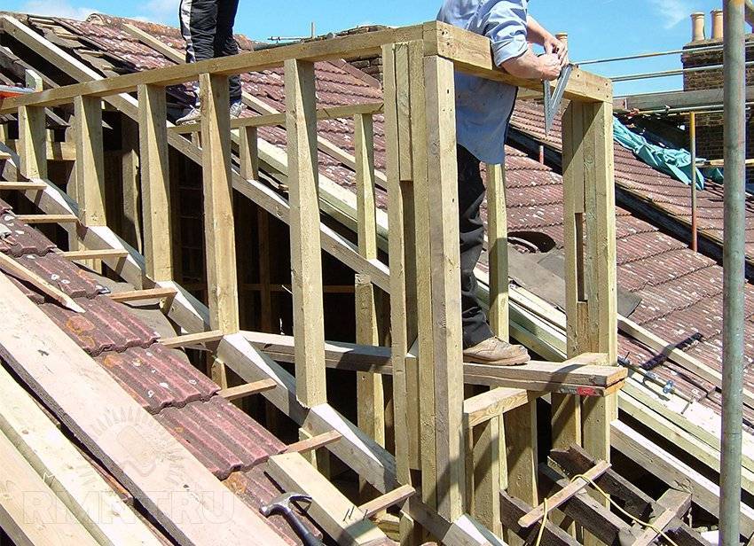 Ещё пара подпорок выносится параллельно установленным в переднюю часть проёма, которая образует вертикальный фронтон за 30–50 см до мауэрлата или даже прямо на нём. Передние стойки соединяют со стропилами горизонтальными перекладинами в торец, подрезав их под соответствующим углом.