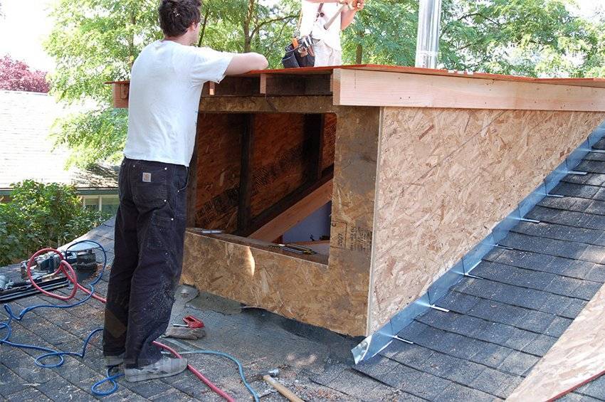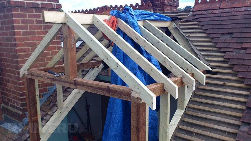 Окончательный этап монтажа каркаса — установка стропил. Их количество зависит от длины конькового бруса, а шаг должен обеспечивать надежность конструкции. Поверх стропил делается обрешетка, на которой крепят кровлю, обычно такую же, как и на основной крыше. На боковые стенки укладываются слои гидро- и теплоизоляции. Материал для окончательной обшивки можно использовать разнообразный: от вагонки до железа.
