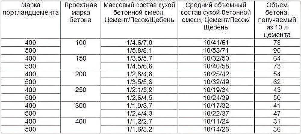 Пропорции бетона на один куб. Масса компонентов указана в килограммах, в скобках даны части