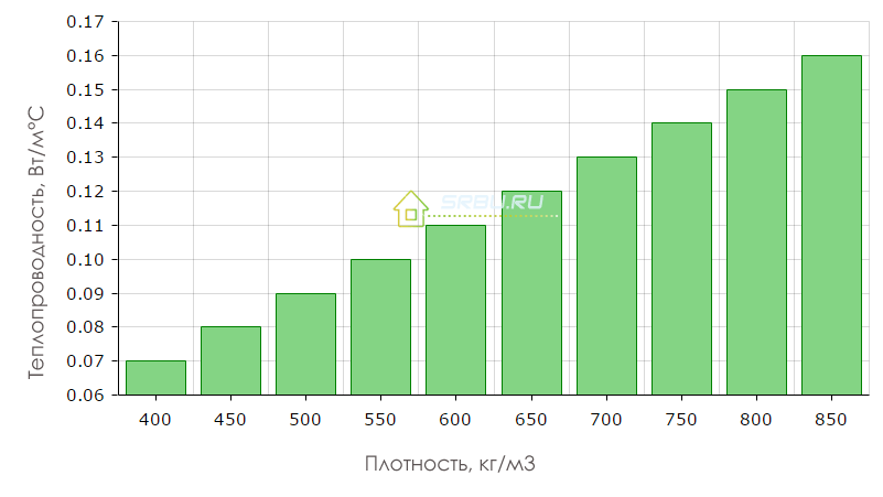 - Теплопроводность – также напрямую зависит от плотности, увеличивается пропорционально: у блоков плотностью 400 кг/м3 показатель равен 0.06 Вт/м К, при 850 кг/м3 коэффициент теплопроводности находится в пределах 0.17.