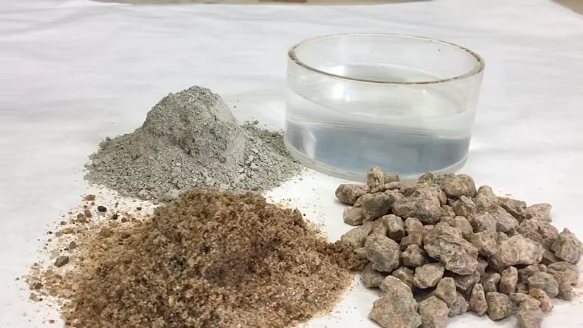 - Цемент смешивается с водой, что создает клей, который окружает элементы заполнителя (песок, щебень).