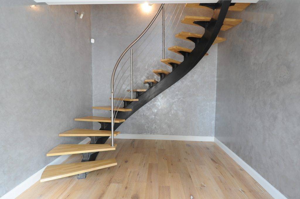 Особая форма – винтовая балка с изысканным дизайном. Подходит для спиральных ступеней. Гармонично смотрится в многолюдных и элитных помещениях.