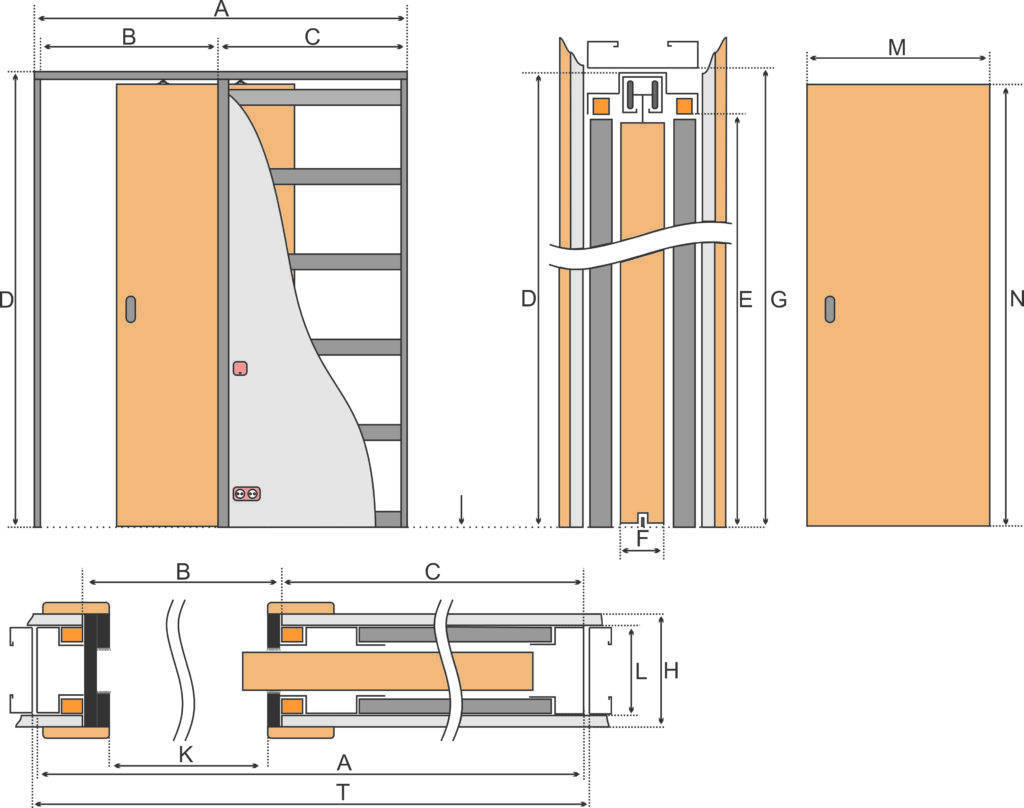 Кассета снабжается направляющей, роликами, стопором и ограничителем, по которым перемещаются задвигающиеся полотна. Элементы конструкции скрыты в большом плоском коробе. Каркас короба не может быть шире, чем толщина стены: в завершенном виде короб — ее часть. Система продолжена в проеме рамкой с рельсами вверху (иногда и внизу). Раздвижные межкомнатные двери, скрытые в стене, очень красиво вписываются в интерьер помещения.