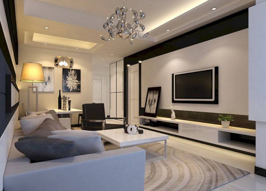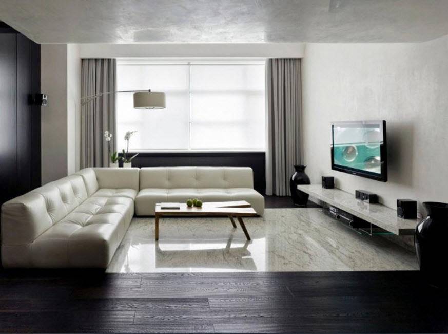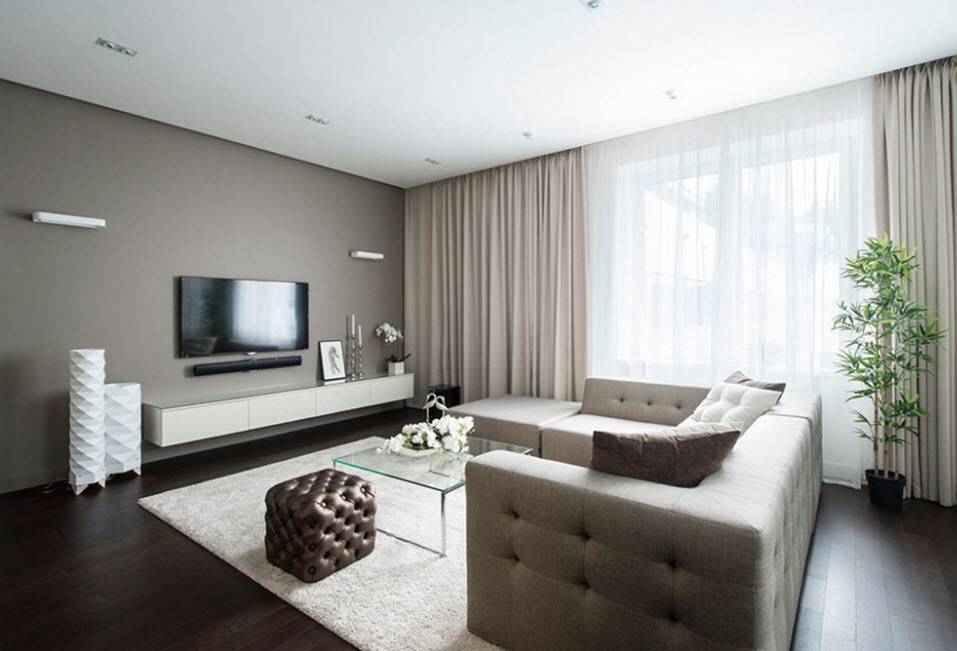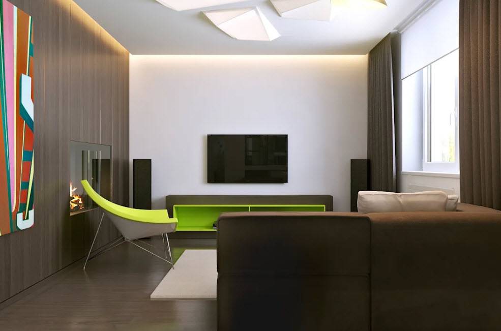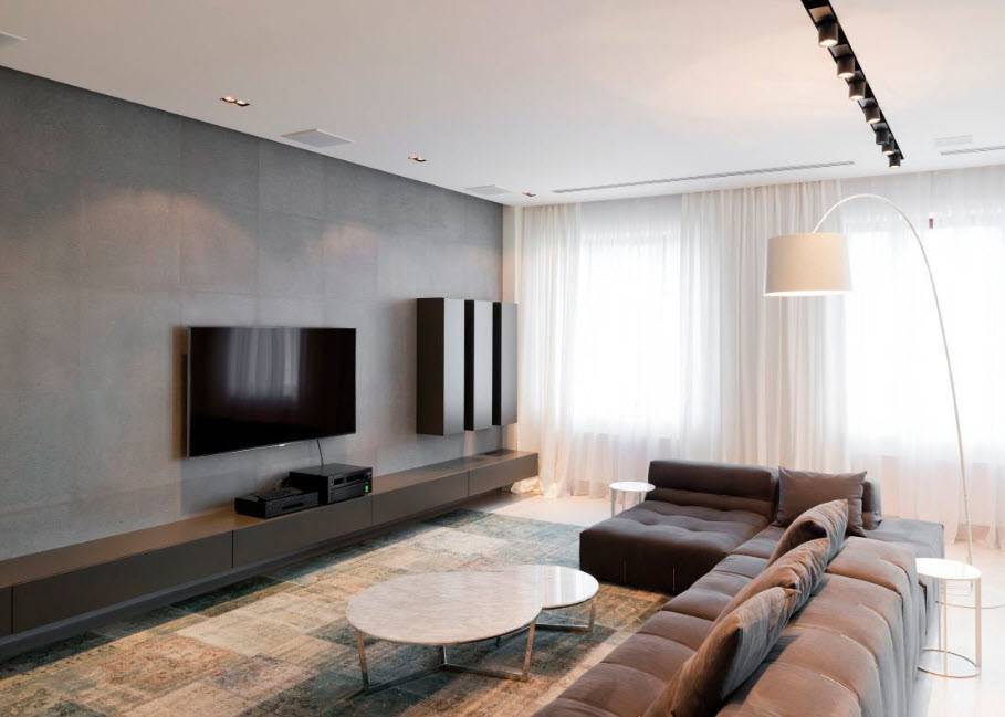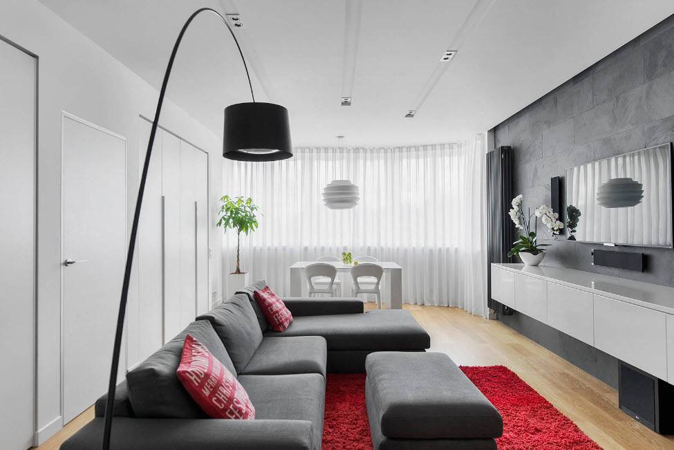 При правильном оформлении зала, используя дизайн концепции минимализм, получится создать сдержанное, но роскошное помещение. Классические цвета декора – белоснежный, черный, светло-коричневый, серый. Разрешается добавлять смелые оттенки (зеленый, красный или оранжевый).
