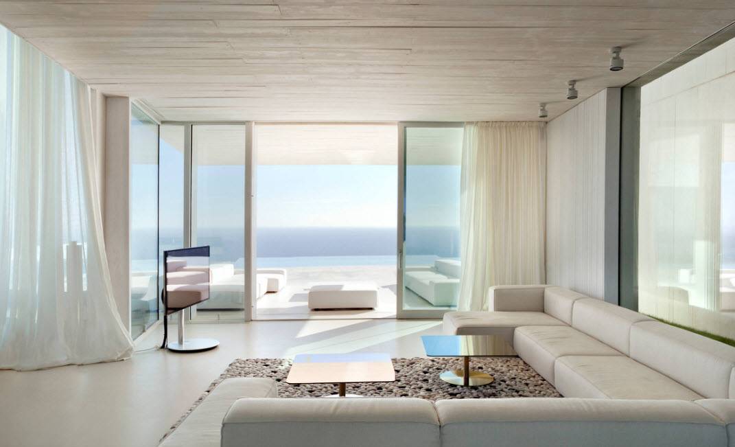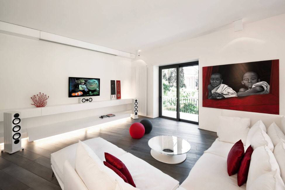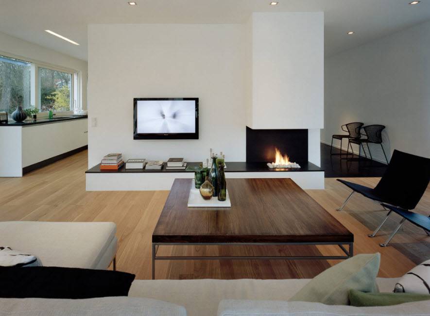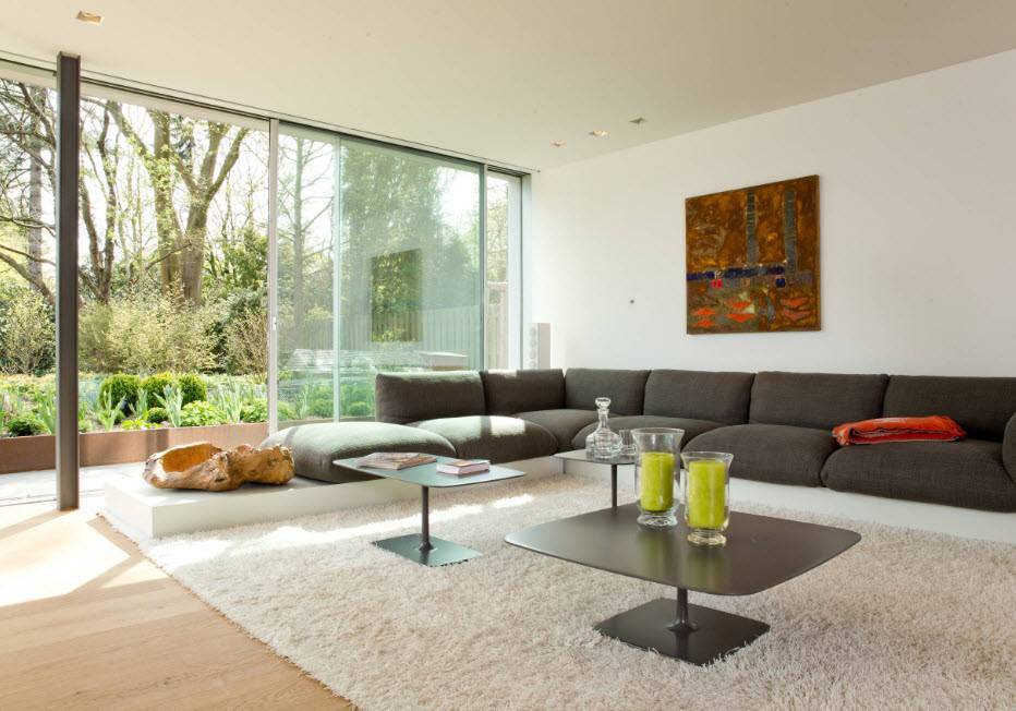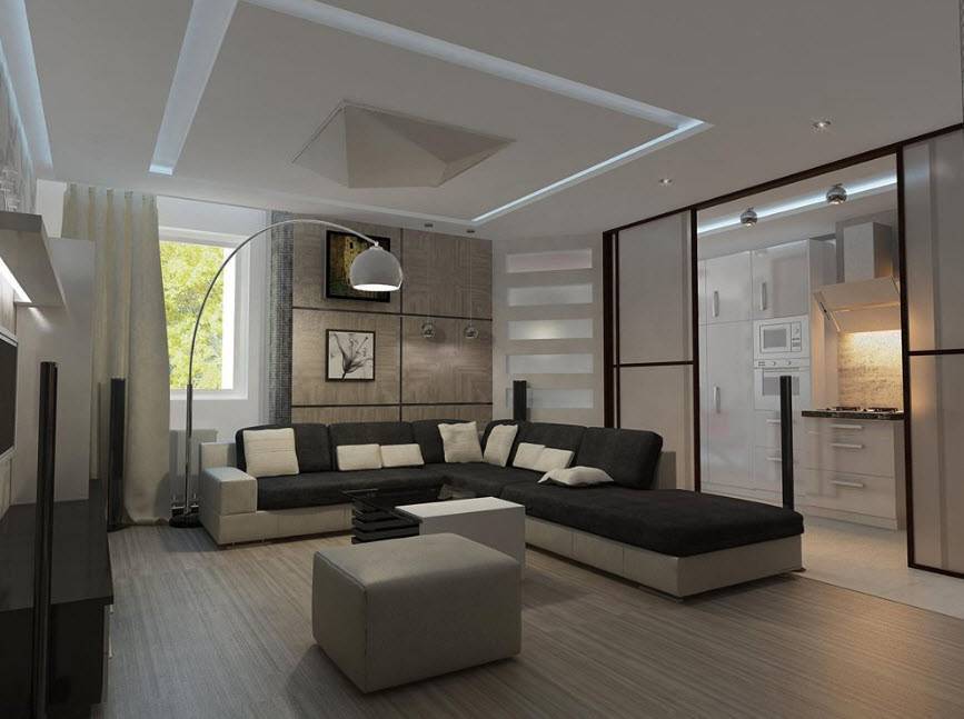 В дизайне главной комнаты дома должны быть продуманы все нюансы. Увеличить пространство получится с помощью больших окон. Используют встроенную мебель, на стену вешают телевизор. Диван, кресла и столик должны иметь строгие очертания и силуэты без изгибов.