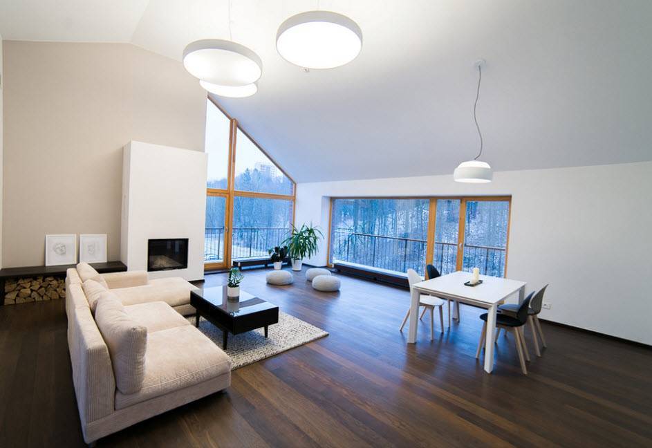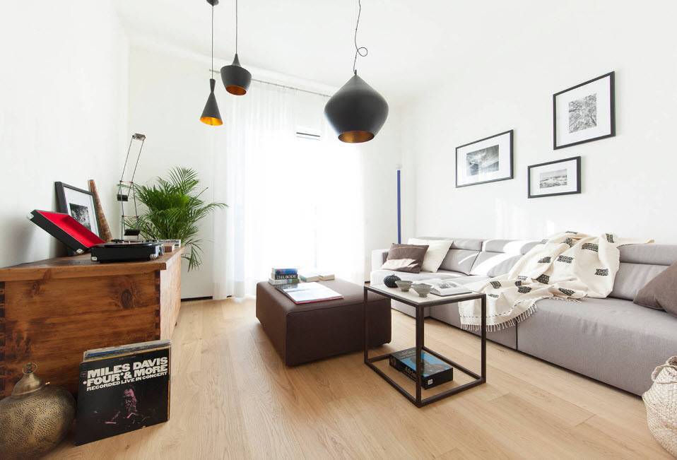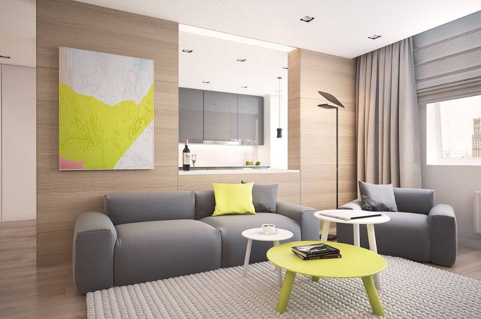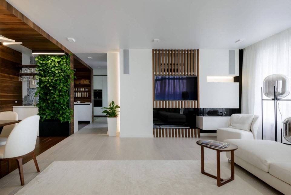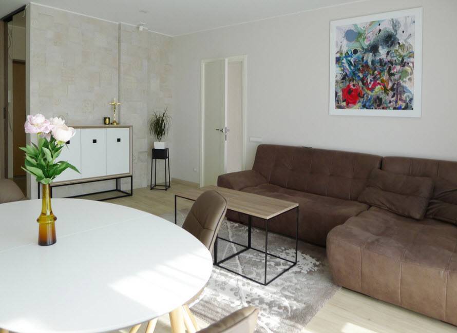Скандинавский опыт минимализма квартиры отличается массивными формами, растительным сюжетом, отделочными материалами из камня и дерева. Раздвижные перегородки, ширмы или барная стойка – отличный способ разделить большое пространство на несколько функциональных зон. Ну а разнообразные светильники и настольные лампы подчеркнут утонченность и изысканность конкретной зоны.