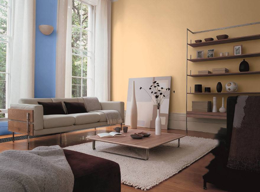 К примеру, если стены окрашены в бежевые тона, мебель берется на несколько тонов темнее, а для придания интерьеру живости используются яркие акценты: яркие подушки, вазы, картины.