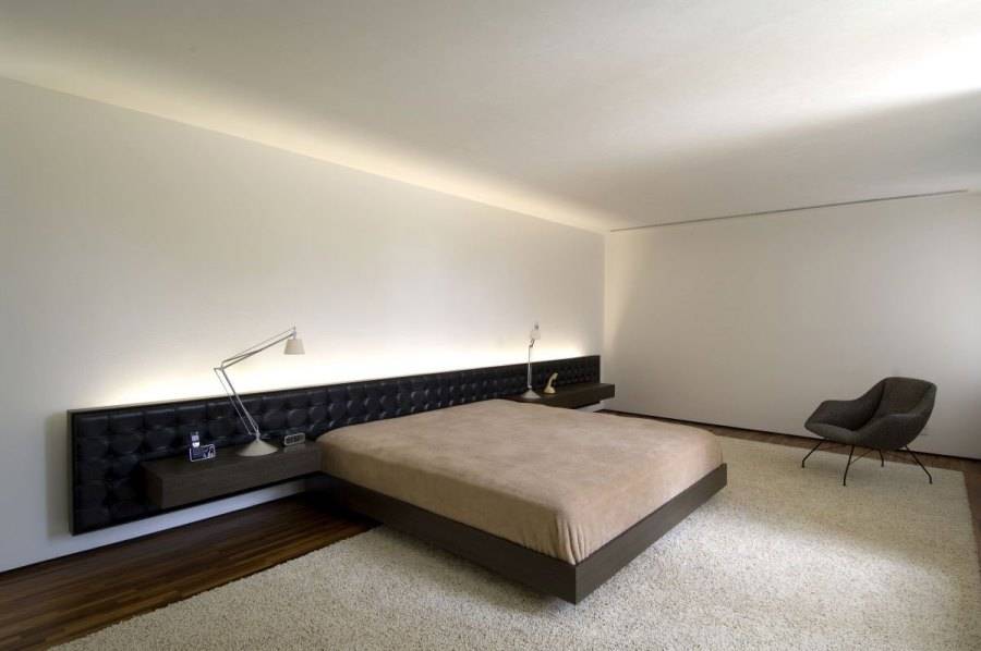 Потолок. Потолок в минималистичной спальне простой, как и весь остальной интерьер. На нем не должно быть ярких декоров, лепнины или бордюров. Оптимальный цвет для оформления потолка – белый или бежевый. Допускается и более интересное оформление: гипсокартонная конструкция строгой геометрической формы, в которую будут вмонтированы точечные светильники. Самое простое, бюджетное и современной решение — матовые натяжные потолки.