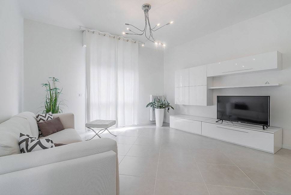Часто используют светильники с абажурами из матового стекла или пластика. Также уместны скрытые галогенные и светодиодные лампы с белым светом. Освещение должно быть точечным и симметричным. Такие приемы помогут создать максимально светлое помещение с равномерным распределением света по всей его территории.