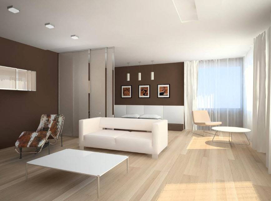 Минимализм не терпит обилия ярких красок — для обустройства интерьера подойдут спокойные выдержанные оттенки, причем их не должно быть больше трех. Предпочтительно использование натуральных цветов, таких как песочный, молочный, бежевый, коричневый. Обычно для создания интерьера в основу берется один тон, который дополняется другими, более насыщенными оттенками.