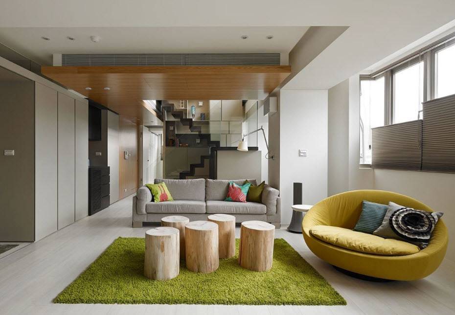 ФОТО: mir-s3-cdn-cf.behance.netПовесьте в центре комнаты гамак, а вместо стола используйте соединённые вместе обработанные пеньки