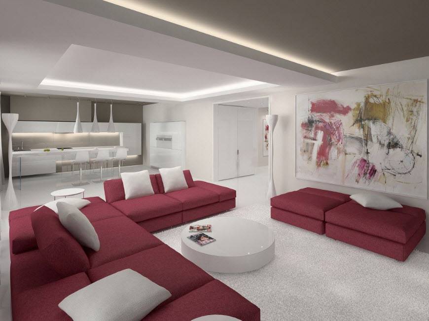 Оформляется в светлый, однотонный цвет. Холодные оттенки белого благородно подчеркнут атмосферу минимализма и мелкие контрастные детали. Многоуровневый потолок добавит строгой «завершенности» в интерьер помещения.