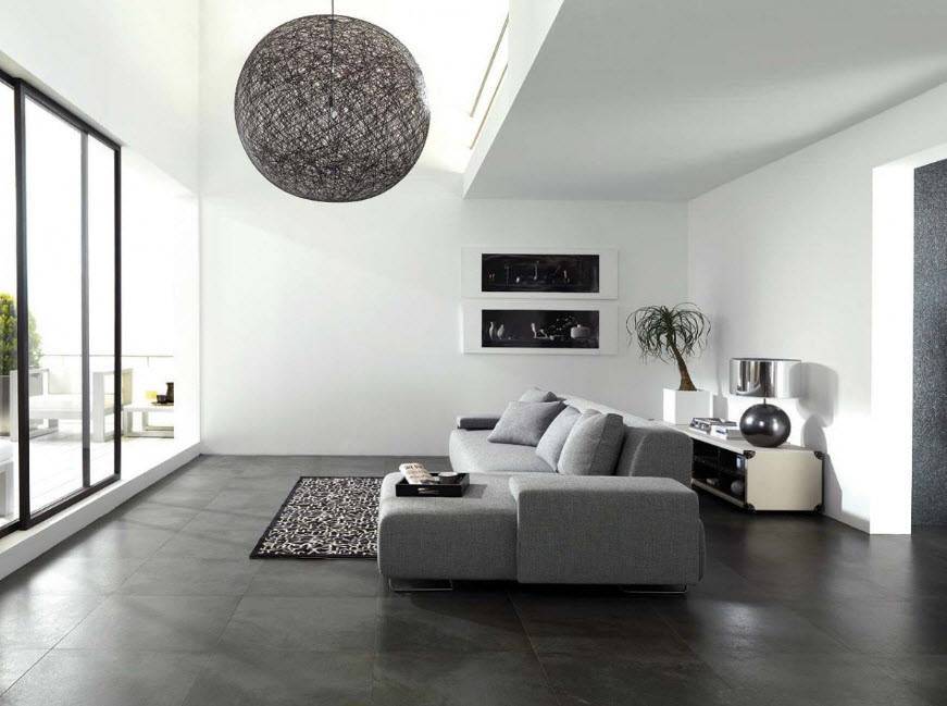 Помещение будет выглядеть нестандартно, если сформировать контраст при отделке пола и потолка по цвету. Чем проще будет дизайн «верха», тем лучше. Многоуровневые конструкции в стиле минимализм не приветствуются. Самое практичное решение – выбор и монтаж натяжной глянцевой пленки. Она будет отражать свет, создаст ощущение наполненности воздуха.