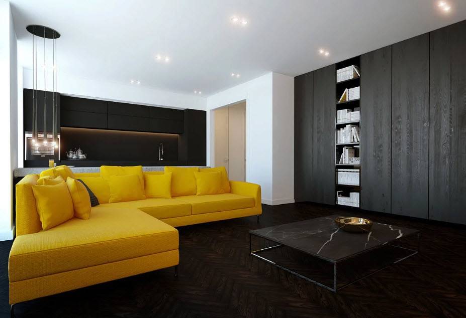 Желто-черная цветовая комбинация создает сильный контраст, принося положительную энергию в жилые помещения. Яркие желтые и красные акценты, смешанные с синими и зелеными цветами выглядят особенно красиво. Функциональный дизайн интерьера и удобный декор дополняются оптимистичными и яркими цветами помещений.