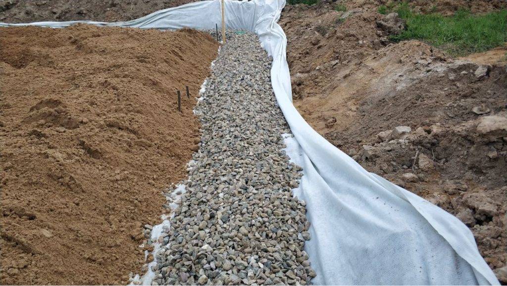 Дренажная труба укладывается в щебень, который обернут геотекстилем высокой плотностиСмотровые колодцы дренажной системы устанавливаются по уровню