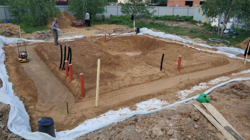 Следующим действием в пошаговой инструкции будет своими руками устройство всех коммуникаций. Их проводят в соответствии с проектом здания и проверяют на месте методом пролива. Иначе после заливки плиты будет поздно исправлять ошибки.