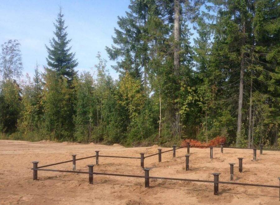 После подготовки участка специалисты размечают территорию участка, нанося на него базисные линии (стены и углы постройки), определяют точки установки и глубину погружения свай, а также уровень, по которому затем они будут выровнены.