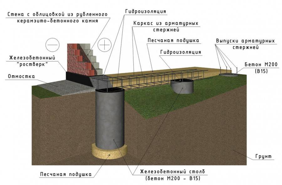 - Незаглубленный или повышенный ростверк располагается на одном уровне с грунтом. Этот вариант считается оптимальным, так как лучше всего распределяет нагрузку на всю плоскость фундамента.