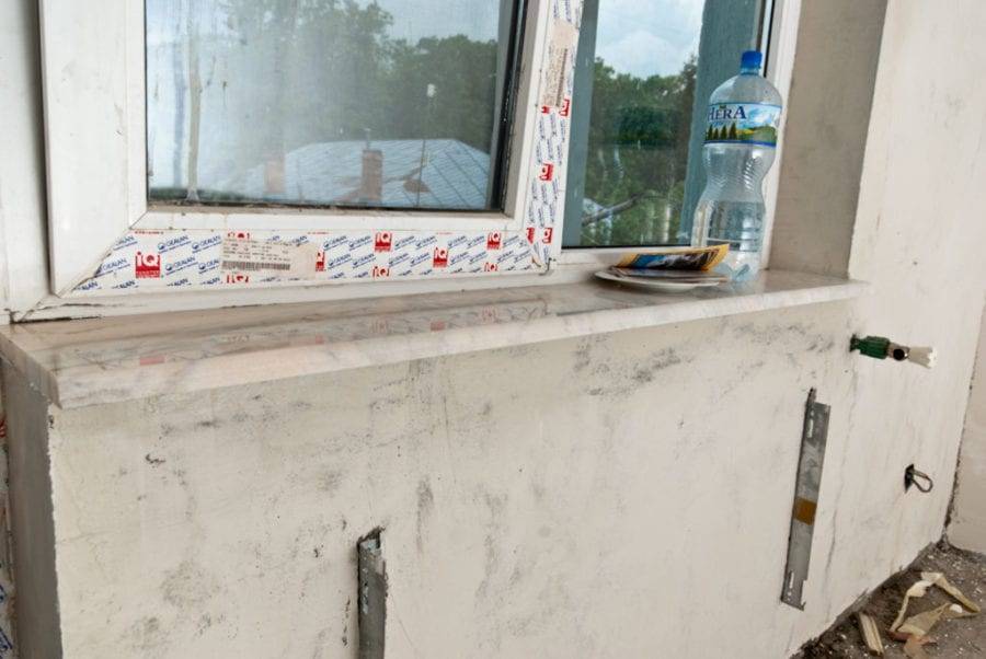 Установку подоконников из камня выполняют либо на стяжку, либо на подложки. В случае с подложками на предварительно выровненную поверхность крепят основание из деревянных реек или водостойкой фанеры.