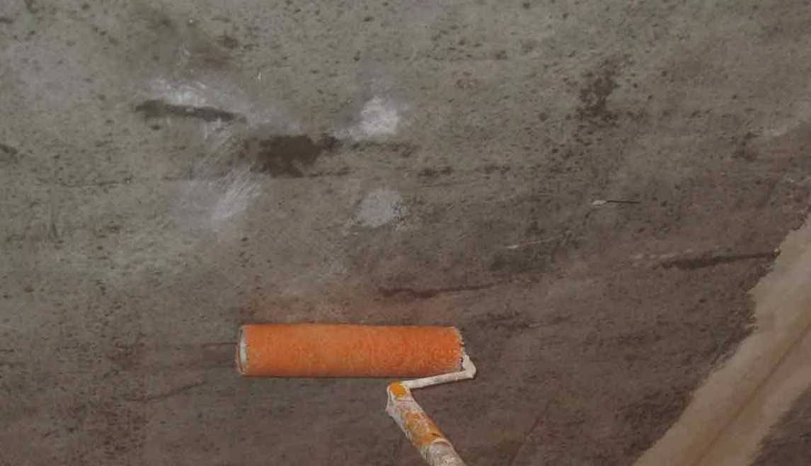 Сначала готовим основание — очищаем от старых покрытий, а потом обрабатываем грунтовкой. Для этого состав наливаем в малярную ванночку, берем валик на длиной ручке (телескопической штанге) и распределяем состав по потолку. Если есть какие-то углубления — выемки, дефекты на поверхности потолка, в которые валик просто не помещается, их предварительно обрабатываем кистью, смоченной в грунтовке.