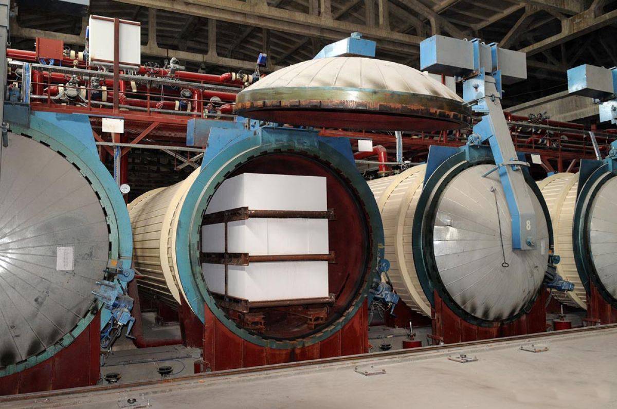 Порезанные блоки отправляют в автоклав и обжигают при температуре +190-200 градусов, давление составляет 8-10 Бар (чтобы из материала полностью вышла влага). Обработка газобетона автоклавом позволяет: ускорить твердение материала, повысить его прочностные характеристики, уменьшить усадку в будущем, сделать структуру однородной, улучшить геометрию готовых блоков.