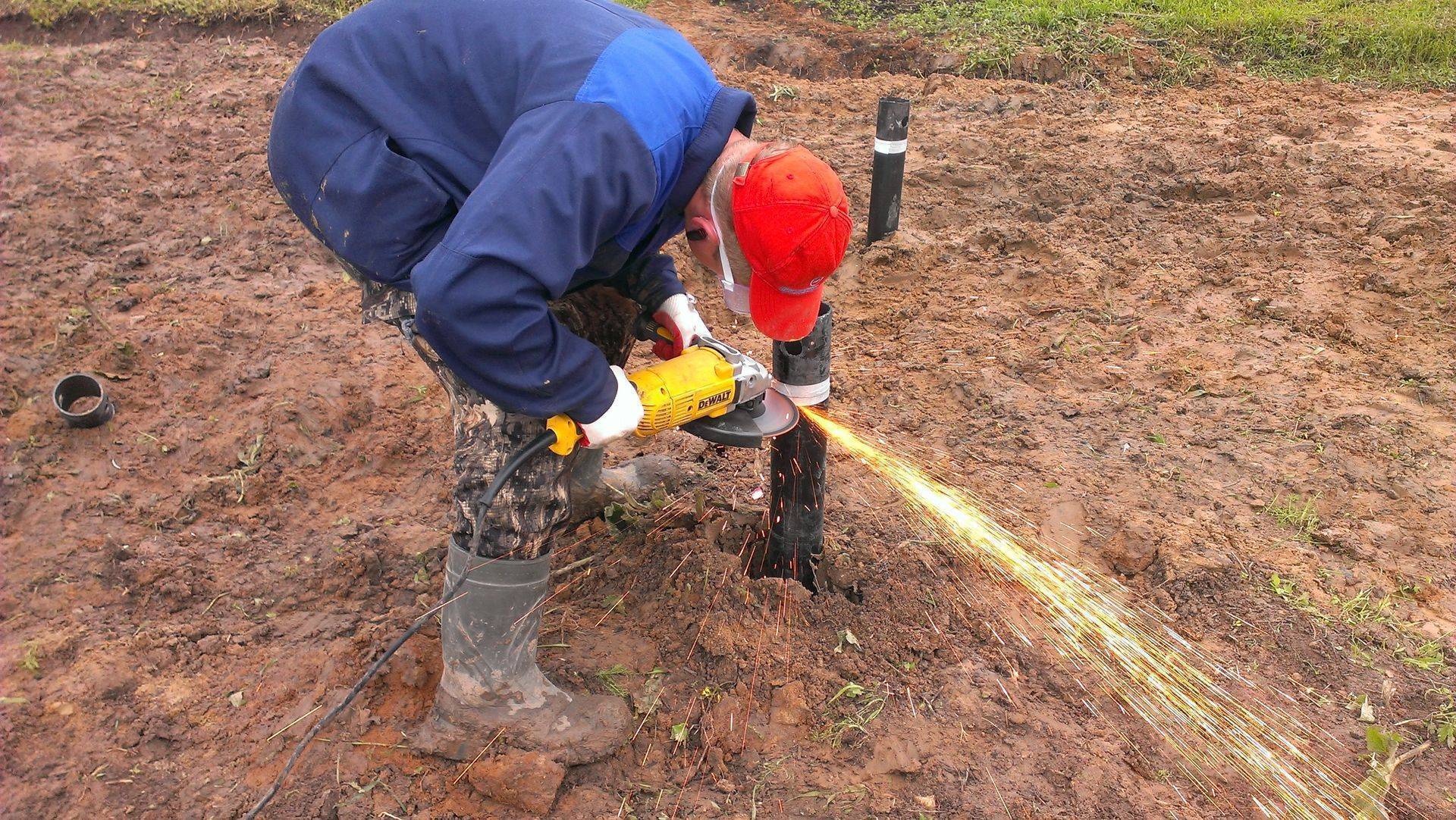 - В зависимости от особенностей рельефа, сваи могут быть вкручены на разную высоту, поэтому после установки их нужно подрезать в один уровень. Размечаем его лазерным осепостроителем или всеми любимым гидроуровнем.