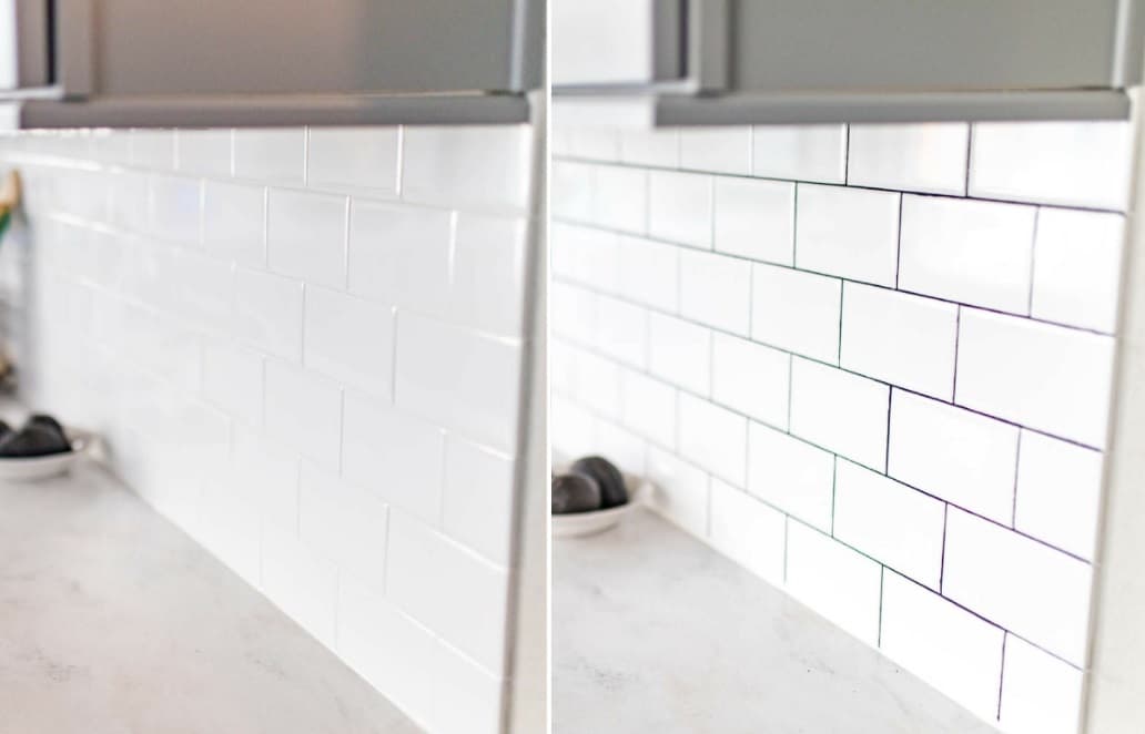Плитка на стенке ванной комнаты. До и после замены затирки.