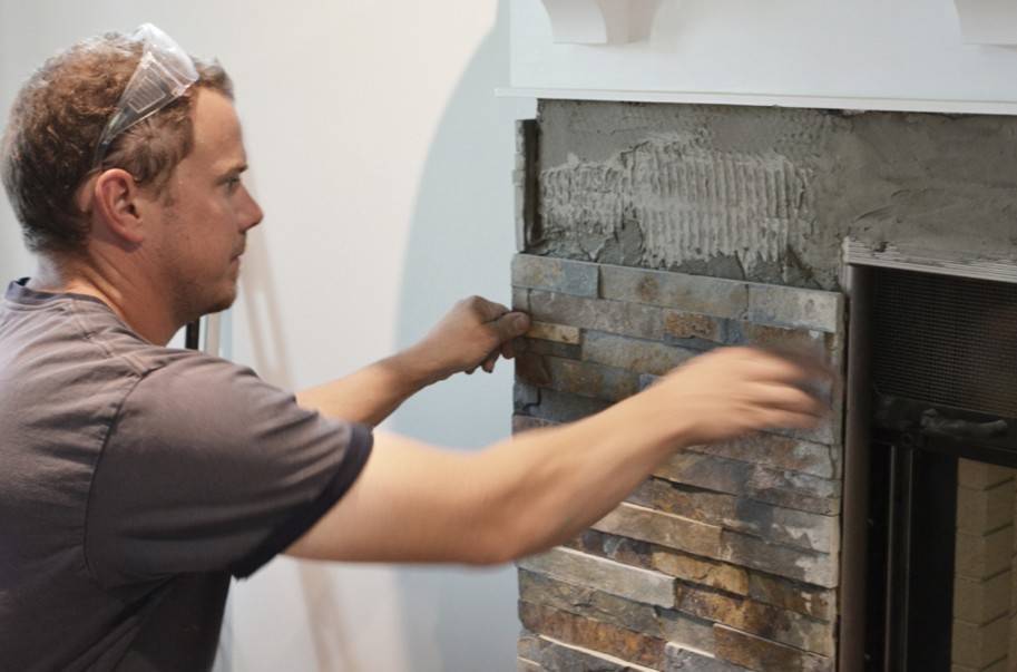 Укладывать декоративную плитку своими руками следует начинать снизу, используя для этого штукатурный раствор с добавлением глины или специальный клей для такого отделочного материала. Многие мастера добавляют в штукатурную смесь соль, благодаря чему повышается ее устойчивость к высоким температурам и предупреждается растрескивание отделки. Клей наносится на плитку с помощью зубчатого шпателя, а толщина слоя должна быть 4 мм.