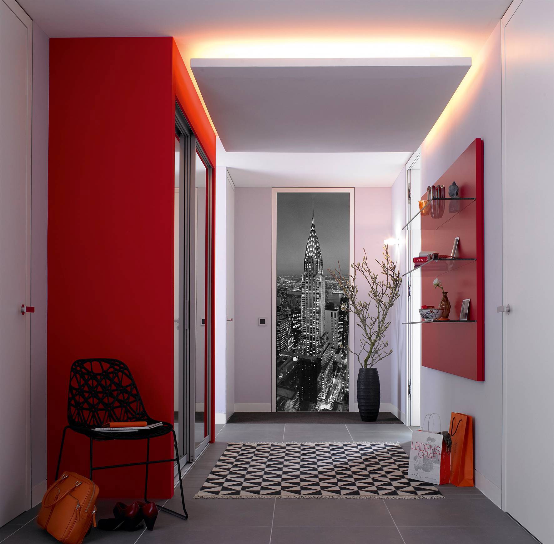 Яркие оттенки тоже имеют право на размещение в маленькой прихожей – с их помощью ты можешь зрительно подправить планировку. Контрастными обоями оклеивают дальнюю стену или две противоположных.