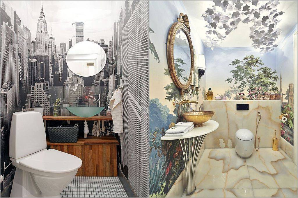 Эффектный, но не самый практичный способ отделки. Фотообои могут сделать интерьер значительно интересней, при этом просторнее за счет оптической иллюзии. Маленькие туалетные комнаты можно отделать изображениями с перспективой, этот прием визуально отодвинет стену. Например, стена за унитазом оформлена обоями с удаляющейся вдаль картиной, а боковые стены отделаны однотонным покрытием. Для большей надежности можно использовать лакированные фотообои, они покрыты защитным водоотталкивающим слоем.