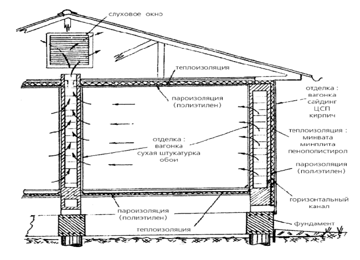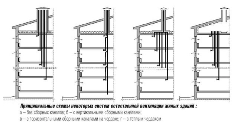 Воздух в помещение попадает через щели или полости в окнах и дверях, или отверстия для подвода воздуха, дальше через вытяжные каналы отводится по вентиляционным каналам в атмосферу. Часто устанавливается обратный клапан для естественной вентиляции — он предотвращает неправильное перетекание воздуха.