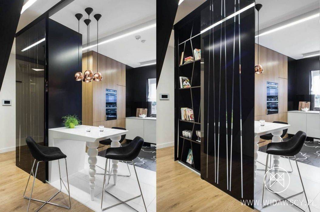 Перегородка в виде шкафа, стеллажа, сплошной или изогнутой фальшстены, расположенная между кухней и гостиной, предоставляет возможность грамотно спланировать пространство, задать ему определенную функциональную нагрузку и обеспечить полный комфорт.