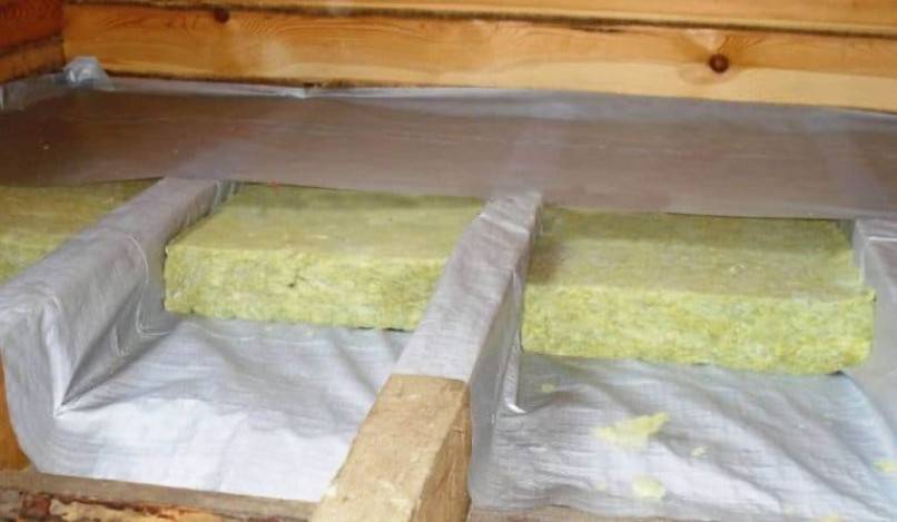 - Затем утеплитель накрывается гидрозащитной пленкой, на которую настилается деревянный пол.