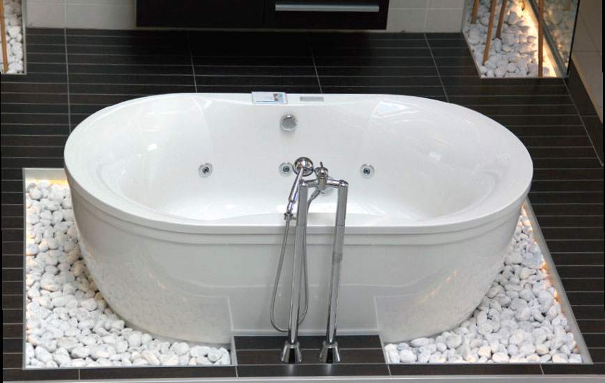- Овальные акриловые ванны имеют приятные плавные очертания. Они подойдут для оформления ванной комнаты в любом стиле. Очень красиво смотрится такая сантехника на подиуме.