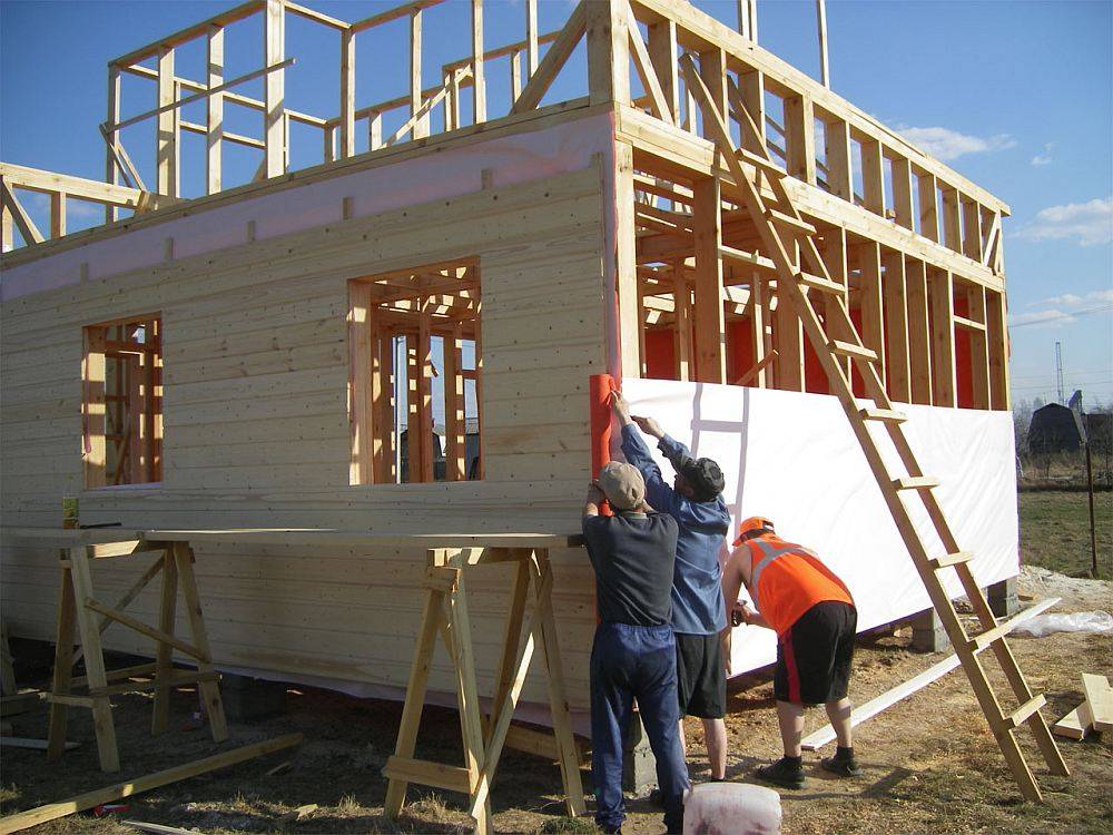 На заранее подготовленный фундамент устанавливают каркас стен, обшивают его, заполняют утеплителем, защищают изоляцией. Таким же образом из заготовленных элементов собирают перекрытия, крышу, затем устанавливают окна, двери и т. д. Время сборки на стройплощадке — 3-12 недель. Работа требует тщательности и неукоснительного соблюдения требований монтажа — проконтролировать это неспециалисту сложно.