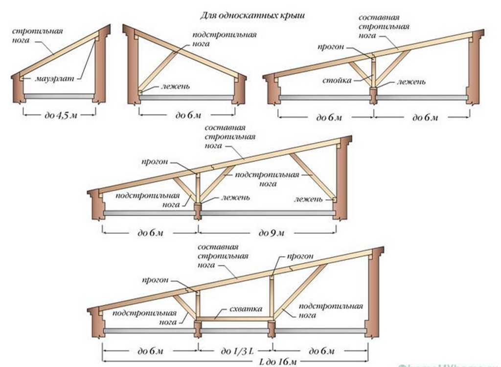 - стропила (стропильная система односкатной крыши имеет свои особенности);