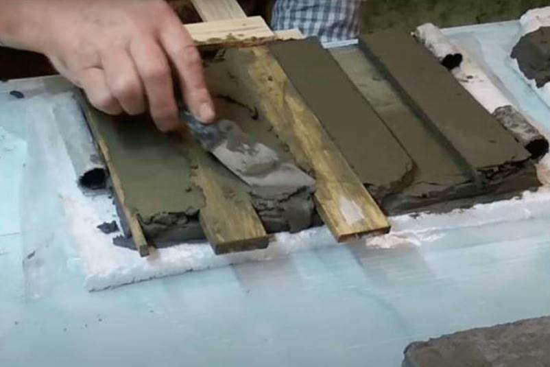 Через пару суток, когда цемент застынет, продолжаем работу. Накладываем сверху на заготовки деревянные реечки с одинаковым шагом и закладываем промежутки между ними раствором.