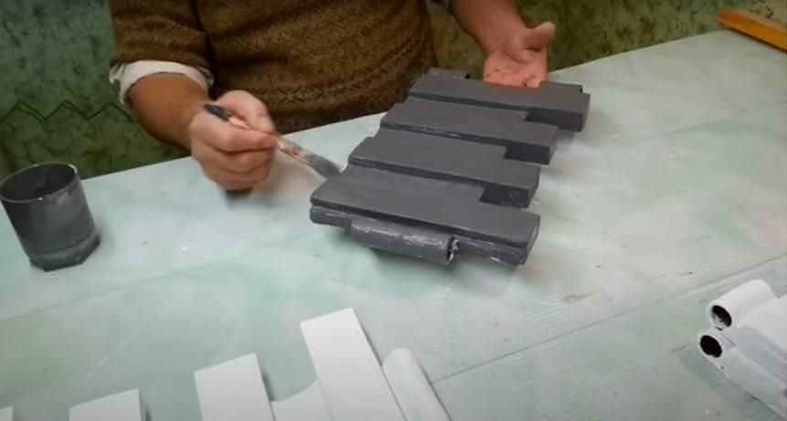Когда раствор потеряет пластичность, убираем реечки и срезаем излишки шпателем. Оставляем секции до полного застывания цемента. Чтобы изготовить аккуратное завершение заборчика, готовим формы из пенополистирола и заливаем в них петли, вырезанные из сломанных стенок ящика.