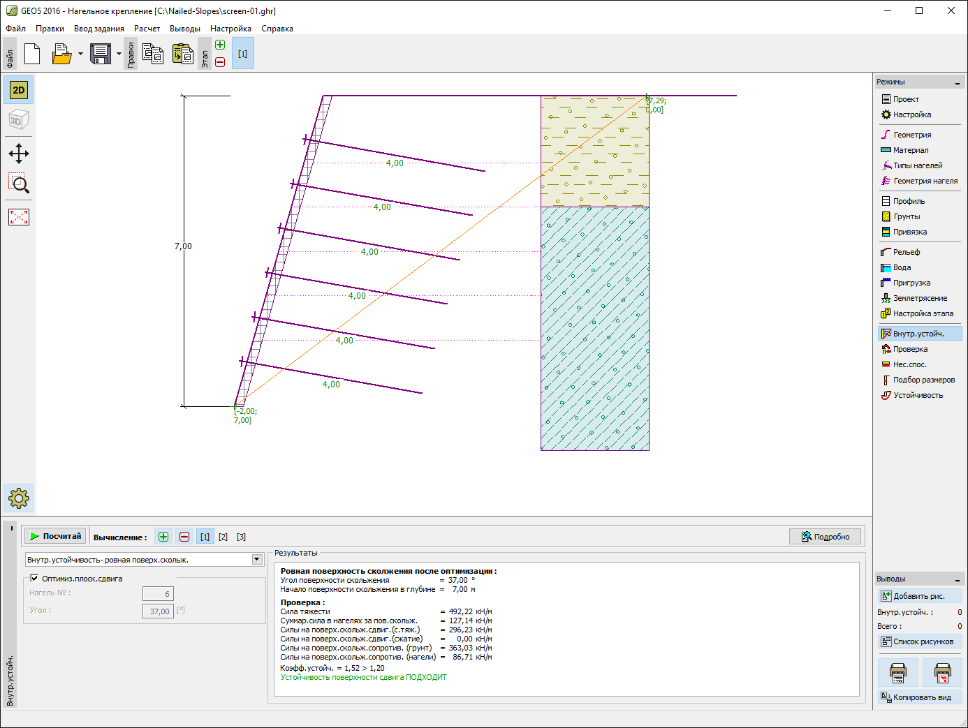 Программный комплекс при достаточно простом и интуитивном интерфейсе позволяет выполнять расчеты достаточно сложных геотехнических систем с разными грунтовыми условиями, гидрогеологической ситуацией, учетом сейсмического воздействия, возможен комплексный расчет с учетом этапов возведения сооружения.