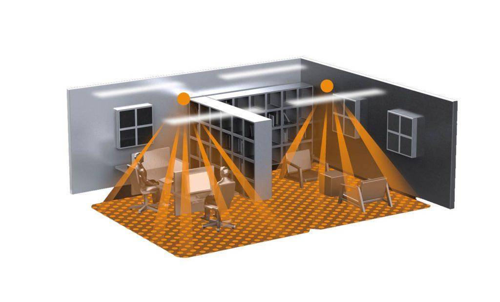 Объемные детекторы движения могут крепиться на стены и потолок, выноситься при помощи кронштейнов или располагаться по углам. Потолочное расположение обеспечивает обзор 360⁰. Одной из наиболее эффективных схем считается «штора», когда детектор устанавливается на высоте двух метров непосредственно над входом.