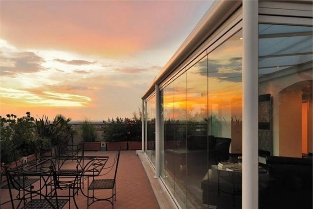 Не уменьшает обзор, превращая террасы в частном доме в обзорные комнаты. Подходит для построек, что имеют из окон красивый вид. Такой вариант подходит как для летнего, так и для зимнего использования, возможна установка отопления, но нельзя сделать аксессуары в виде москитных сеток.