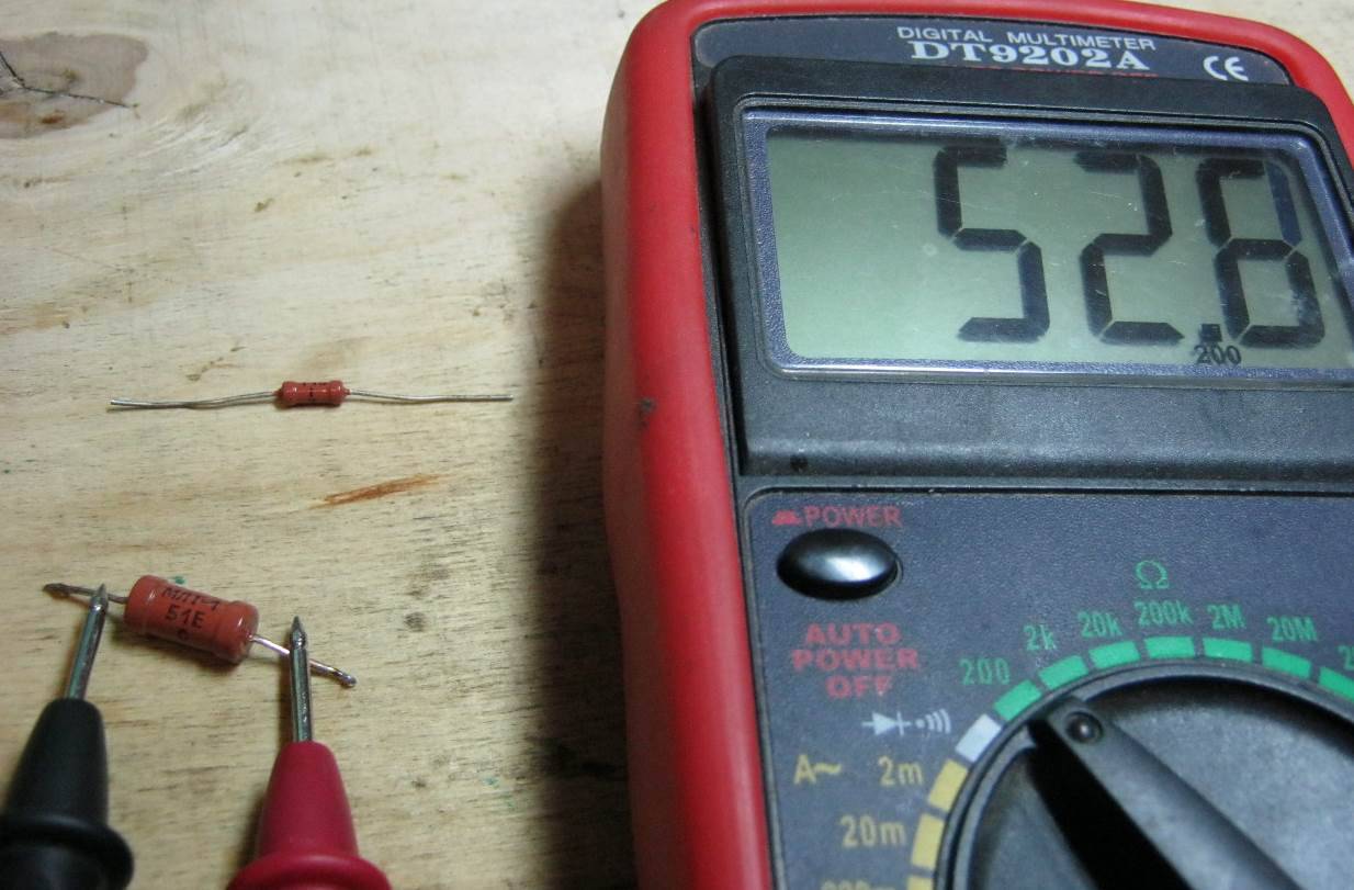 Замеряем сопротивление большого резистора R2=52,8 Ом.