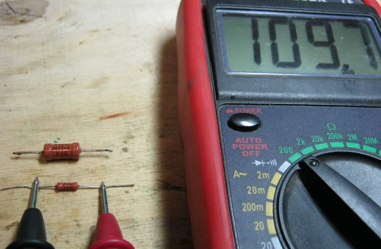 Замеряем сопротивление маленького резистора, R1=109,7 Ом.