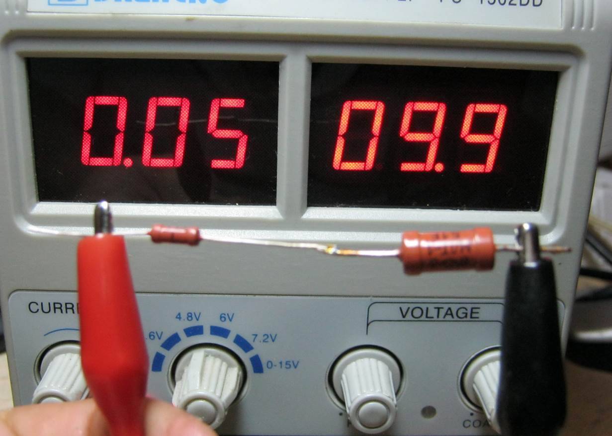 Цепляемся блоком питания за эти два резистора, запаянные последовательно. Напомню, что на блоке ровно 10 Вольт. Показания амперметра на блоке питания тоже немного неточны. Силу тока мы будем замерять в дальнейшем также с помощью мультиметра.