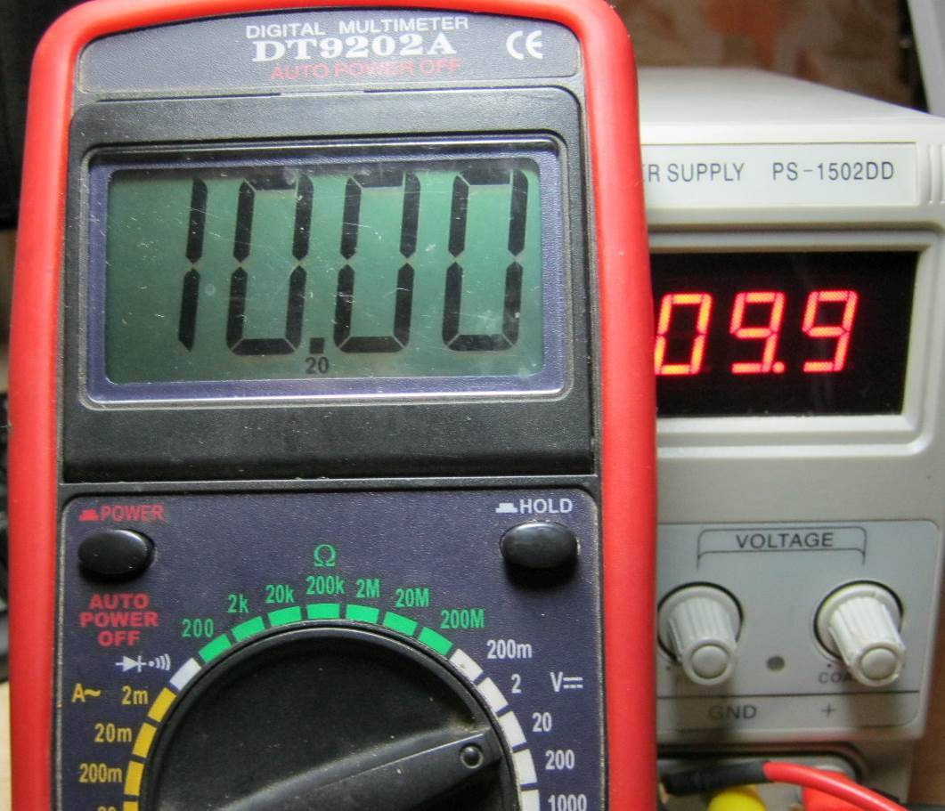 Выставляем на блоке питания ровно 10 Вольт. Замер напряжения производим с помощью мультиметра.