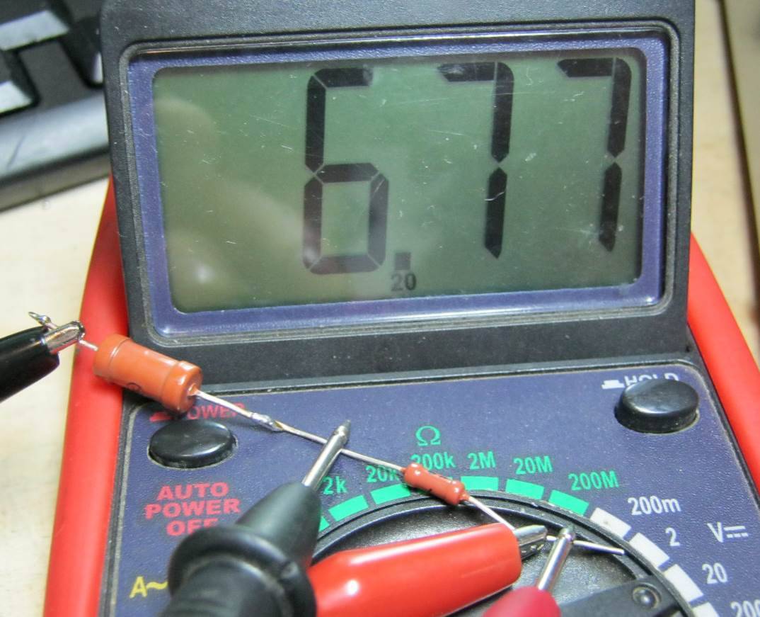 Замеряем напряжение на маленьком резисторе номиналом в 109,7 Ом. На нем падает напряжение 6,77 Вольт.