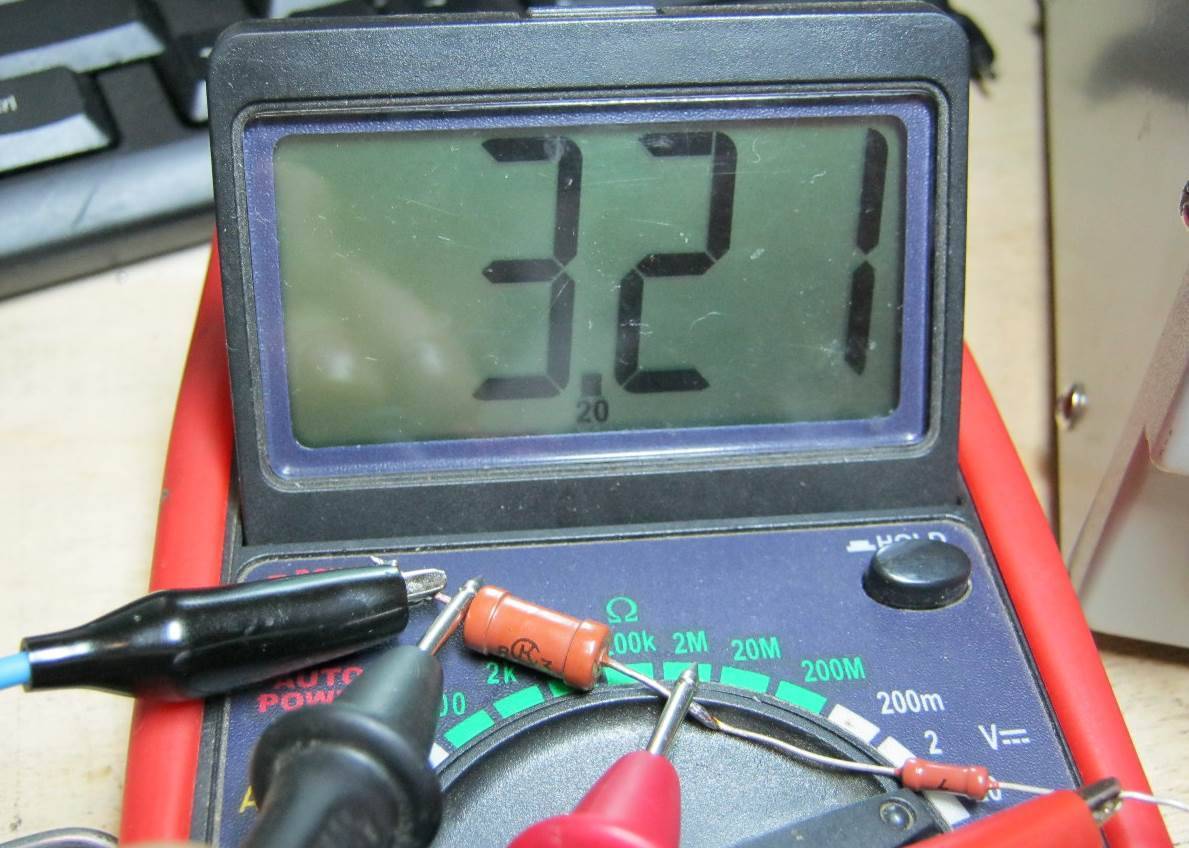 Замеряем падение напряжения на большом резисторе, который обладает номиналом в 52,8 Ом. Мультиметр намерял 3,21 Вольта.